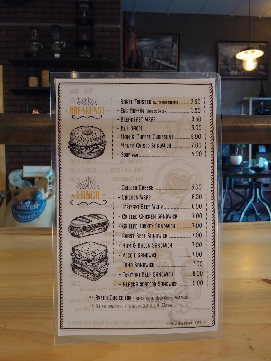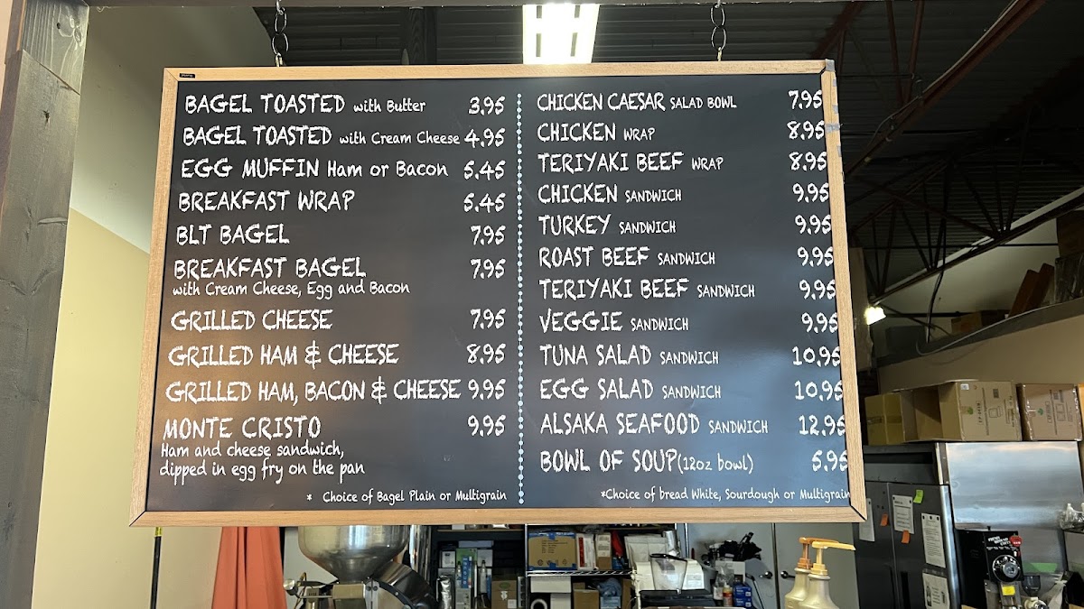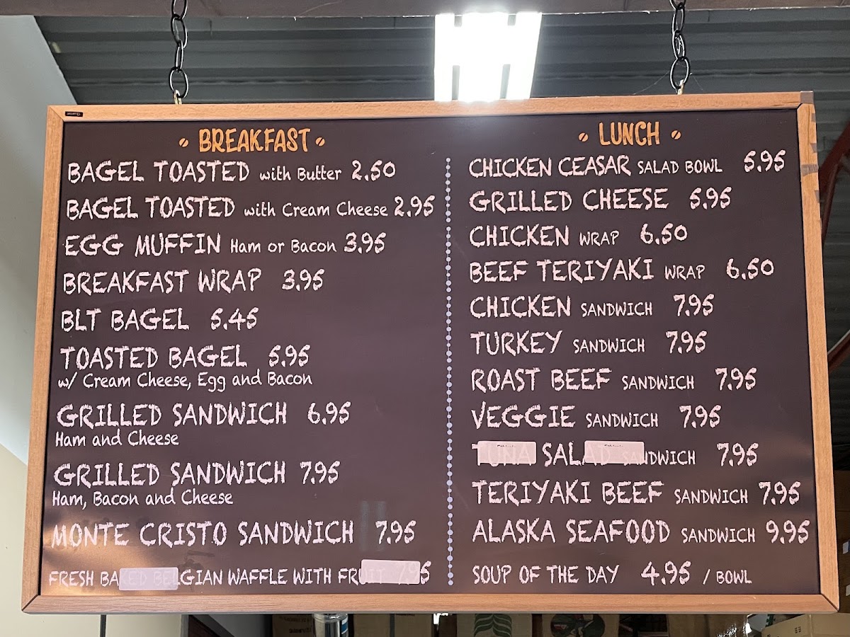 Lunch Options include a selection of sandwiches and wraps featuring proteins such as chicken, turkey, roast beef, beef teriyaki, and Alaskan seafood. Vegetarian choices are also available, including a veggie sandwich and a classic grilled cheese. Additionally, a Chicken Caesar Salad Bowl and a daily Soup of the Day provide lighter meal alternatives.