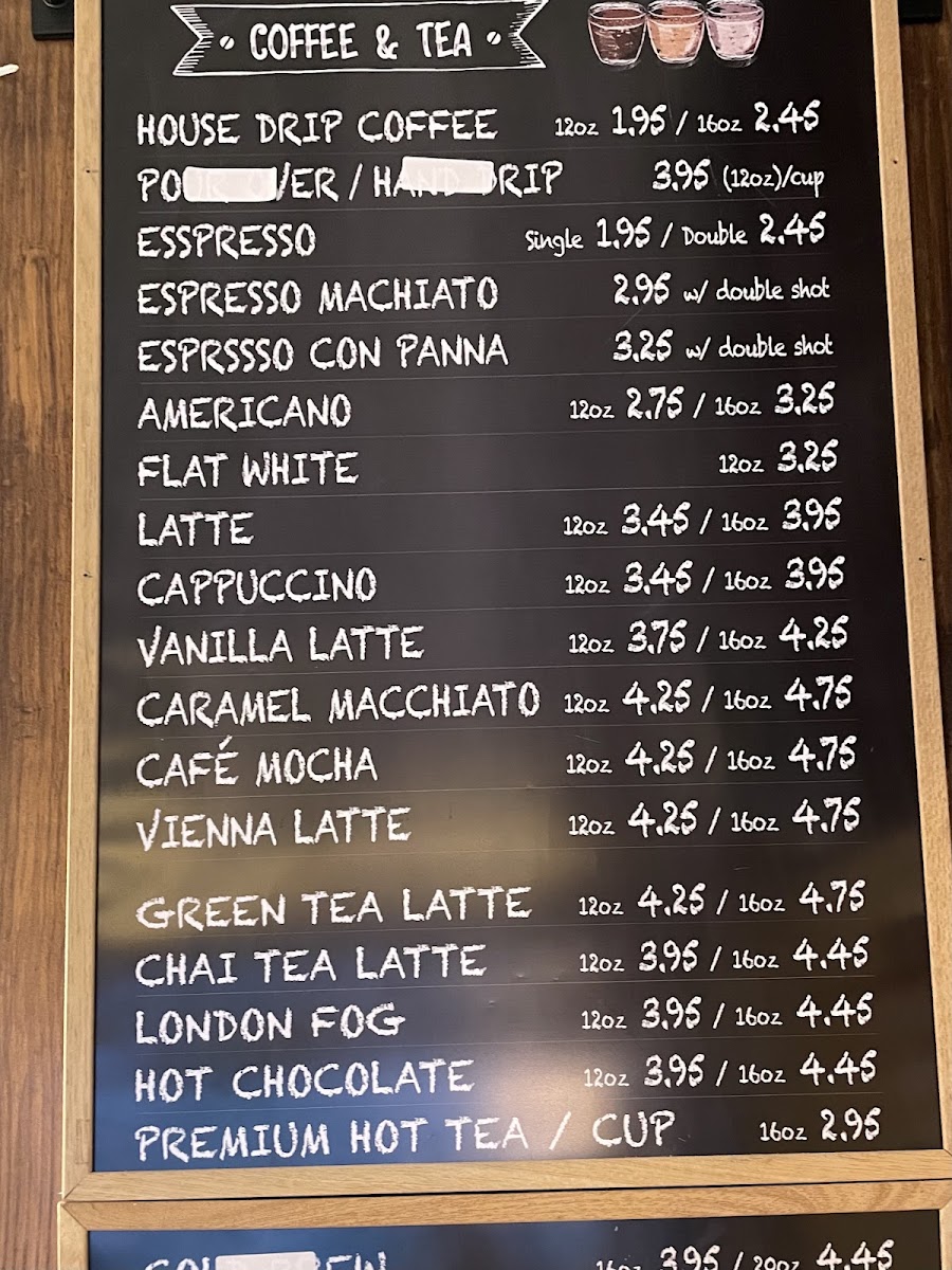 Coffee and Tea offerings cover a wide range of brewing styles and flavors. Coffee options include house drip coffee, pour over/hand drip, espresso-based drinks like espresso macchiato, cappuccino, and various lattes including vanilla, caramel macchiato, café mocha, and Vienna latte. Cold beverages such as cold brew and double espresso with ice cream are also part of the menu. Tea selections feature matcha green tea latte, chai tea latte, London Fog, premium hot tea, and green tea latte.